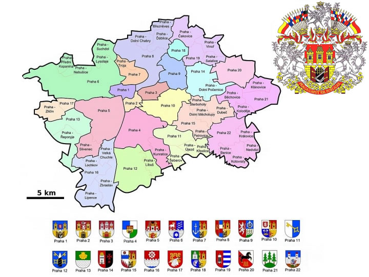 Praga se divide en 22 distritos concéntricos numerados del 1 al 22 que, a su vez se dividen en municipalidades o barrios.